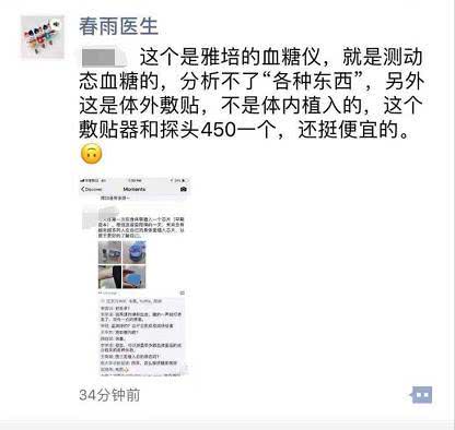 从现有的信息来看,所谓皮下植入芯片的事,应该是这位业外人士的理解和实际情况出现了一定的偏差。据春雨医生微信号介绍,他购买的应该并不是他自己所说的"能检测多种参数"的芯片,而是2017年刚刚被美国FDA批准上市的雅培瞬感扫描式血糖仪。