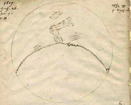 17世纪初,望远镜还是一种比较稀有的工具。1609年初,英国数学家、天文学家哈里奥特(1560~1621)买了第一架个人望远镜,放大率仅为6倍。7月26日晚,哈里奥特用望远镜观测月球,绘出了目前可考的人类第一幅月球表面素描图。该图尽管粗糙,只描绘了月面“危海”、“静海”等极其有限的区域,但图左上角那个日期告诉了人们这幅图载入史册的原因,它比伽利略绘制的首张月面图早诞生4个月。