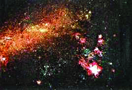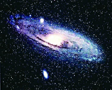 太阳是离我们最近的恒星,太阳光从太阳发出来到达地球,按照光速传播,需要8分多钟的时间。所示是太阳系所在的银河系,有相当于1000亿个太阳质量的总质量。银河系像一个漩涡状的扁盘,光从扁盘的中心到同样在扁盘上的太阳系,要走28000年,银心距离我们就是28000光年。银河系是一个星系,离我们最近的另一个星系叫大麦哲伦星云LMC,距离我们有16万光年,而最近的另一个像银河系的旋涡星系M31,距离我们有236万光年。