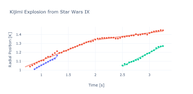考虑到这一点,我们可以挑选三块碎片,它们从行星的边缘(如摄像机中所看到的)开始以不同的方向向外扩散。跟踪应用程序随后给出了碎片行进距离(从行星中心测量的每个物体的径向位置)与时间的关系图。