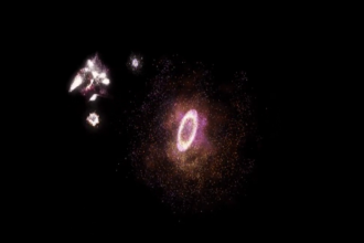 两个星系之间发生剧烈的灾难性碰撞,形成了极为罕见的环形星系,距地球约110亿光年。 怪异的甜甜圈状星系正在其巨大的环中制造恒星,速度比我们所处的银河星系快50倍,从而为它赢得了不祥的绰号:宇宙火环。