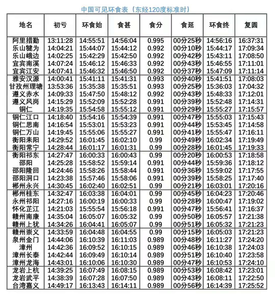 也就是说,在我国只有上述省份中的少部分地区,可以目睹“金边日环”的胜景,这狭长的环食带相较于960万平方公里的广袤国土而言,绝对称得上是“天选之地”了。已经有网站总结出了部分幸运城市日环食的基本信息:
