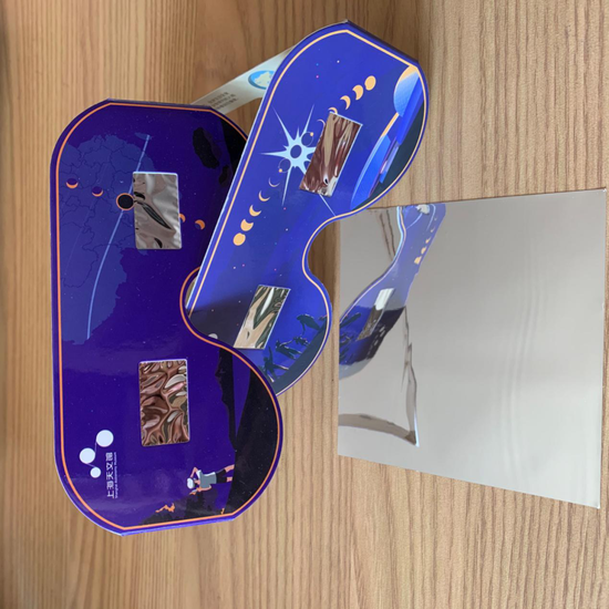 一般最常用的日食观测工具是贴有巴德膜的日食眼镜。巴德膜是德国Baader Planetarium公司发明的一种镀了金属的树脂膜,看起来有点像我们厨房里用的铝箔纸,特殊的材料可以将太阳光消减十万倍,能够较好的满足观测太阳时的安全性,但同样建议每隔几分钟就休息一下眼睛。