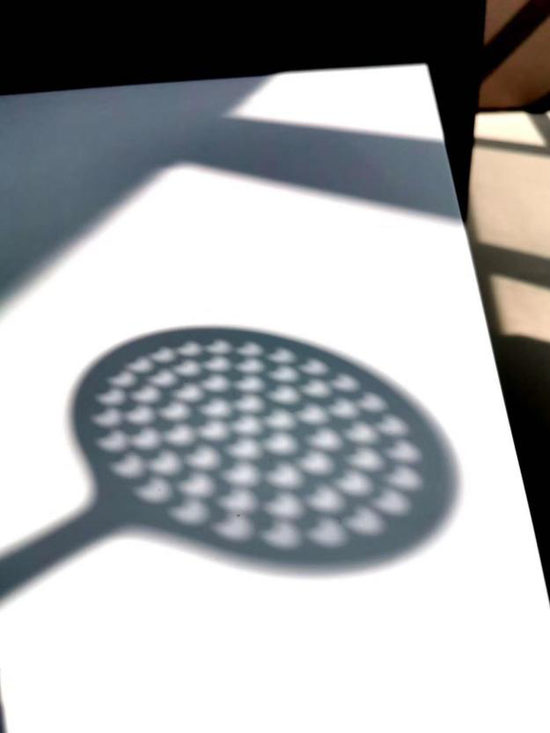 小孔成像原理初中物理就学过。我们可以拿针在硬纸板上扎孔,组成各种图案或者文字,放在阳光下,将倒立的日食影像投影到地面、人的身上等位置。其实身边还有很多现成的小孔可供选择,譬如树叶之间的缝隙就是自然的小孔,双手较差指缝之间的缝隙同样可行,而家中的漏勺、蒸锅篦子也可以拿出来尝试,在阳光下烹饪出一个个可爱的“日牙饼”。