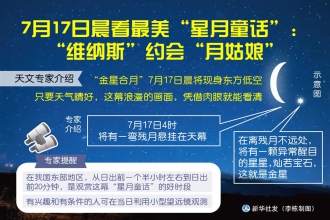 天文专家介绍,作为“行星合月”里最美的一幕“星月童话”,“金星合月”7月17日晨将现身东方低空。届时,璀璨金星将与一钩残月演绎“星空私语”。只要天气晴好,这幕浪漫的画面,凭借肉眼就能看清。