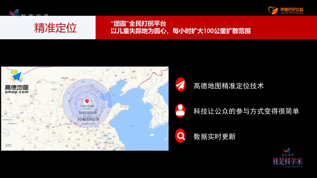 我们根据警察在团圆平台上面发布的信息,以儿童丢失的位置为中心画一个半径一百公里的圆——可以理解为一个虚拟的电子围栏,我们会给围栏里所有的人推送信息。