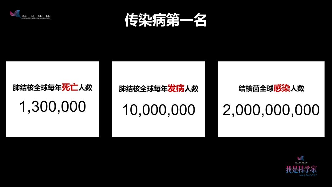 左边的数字是130万,是全球每年因为结核病死亡的人数。也就是说,每一分钟,就有三个人因为结核病离开了我们。如果单纯地从致病危害来看,结核病致死的人数是所有传染病当中的第一名。