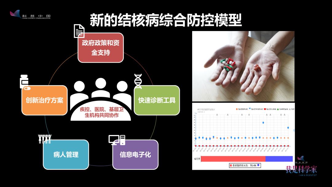 模型包括了政府的政策和经费支持,快速诊断工具,病人管理和创新治疗方案。过去两个月才能诊断的耐药结核病,现在两个小时就可以诊断出来;过去病人要吃一把药,现在只要吃三四片就可以。