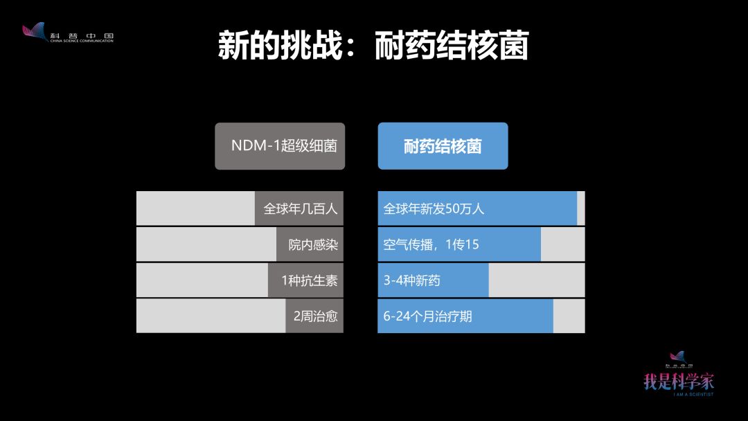 致病人数方面,NDM-1每年有几百人发病,而耐药结核病每年有50万人发病。