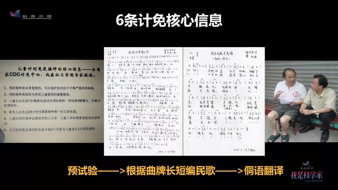 我们公共卫生专家和计划免疫专家一块研究,提出了儿童计划免疫的六种核心信息。我们找到民族文化馆馆长,请他们将信息翻译成侗语,然后另外找一拨识汉字的侗族人翻译回汉语,从而把握文字的科学性,同时加工它的艺术性。
