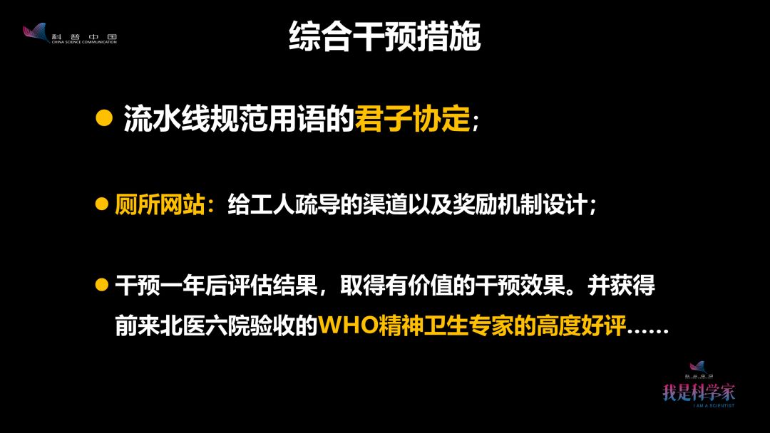 我们还提出了一些综合干预措施。比如针对流水线问题,我们把利益相关方都召集到一块讨论协商。问管理者: