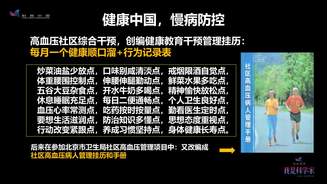 从九七、九八年开始,我陆续参加了李立明教授主持的高血压社区综合干预项目、武阳丰教授主持的中国五省农村地区高血压限盐健康教育干预项目、国家科委的心脑血管项目,还有王海俊教授主持的“小手拉大手,减盐齐步走”、“合理吃动、健康体重”等等多个项目。