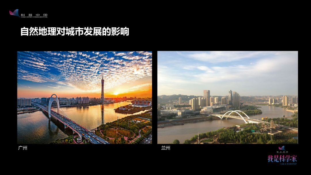 左边这幅图是广州,云山和珠水是广州留给人最鲜明的印象。右边是我曾经生活过四年的兰州市,非常漂亮,黄河从中穿流而过,四周都是山,塑造了整个城市的形态和精神。