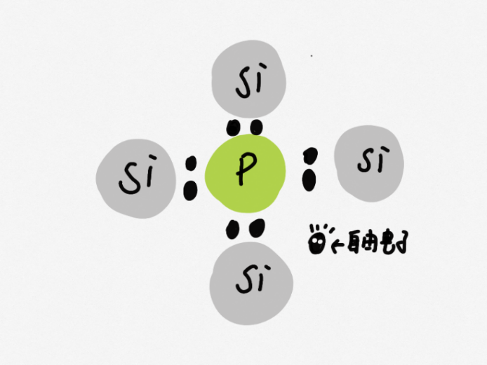 如果我们给本征半导体掺杂一些杂质,情况会有什么不同呢?比如把其中一个硅原子换成磷原子,磷原子有15个电子,排布是2-8-5,最外层有5个电子,和相邻的硅原子凑齐8个电子之后,还多出来一个电子。这样每掺一个磷原子,就会有一个无处安放的电子,掺多了就会形成一支“单身电子大军”。我们称这样的半导体为N型半导体,N(Negative)表示电子带负电。