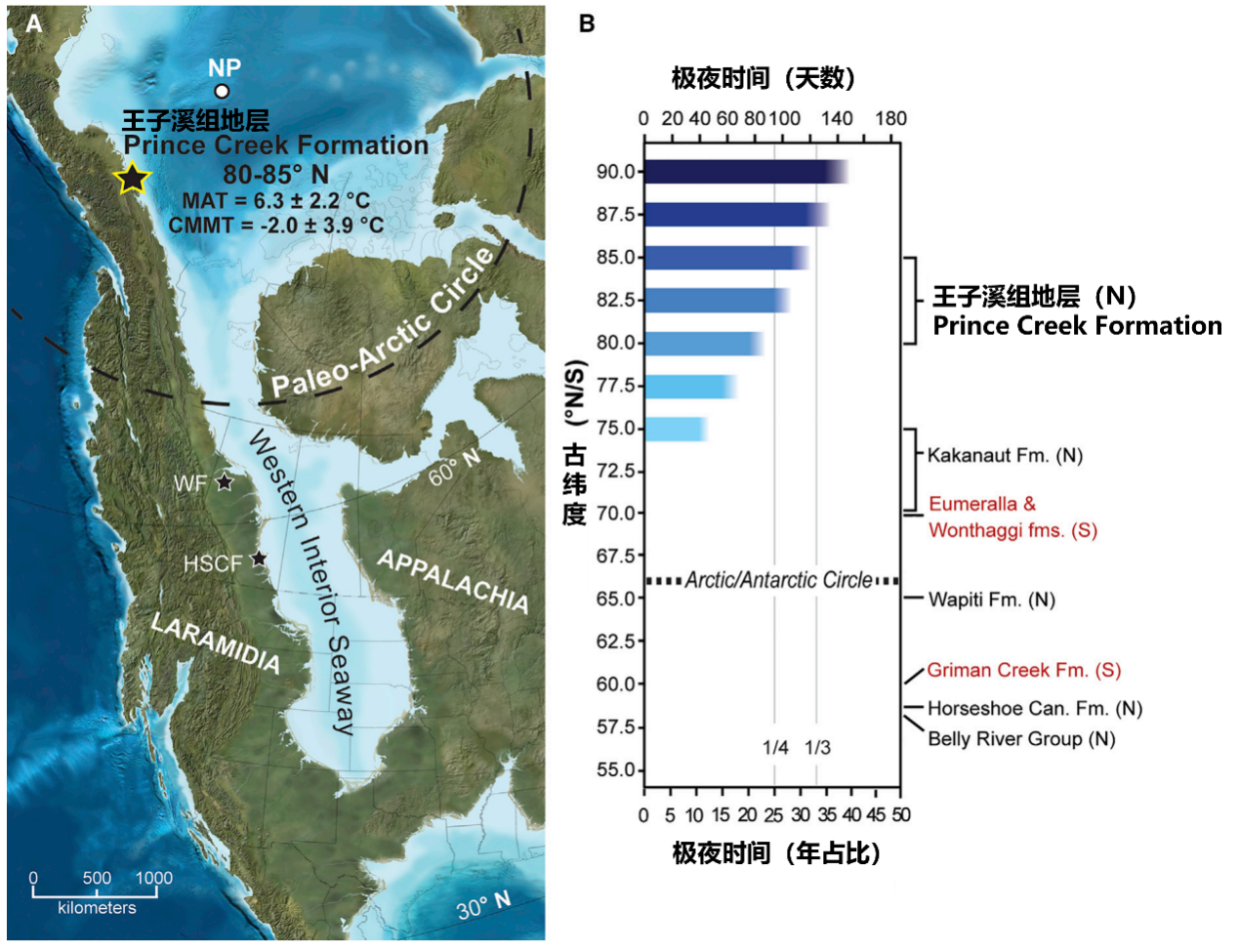 王子溪组地层的位置和古环境条件:(A)7200万年前的北美洲(B)不同纬度地层的极夜时间(图片来源:修改自参考文献1)