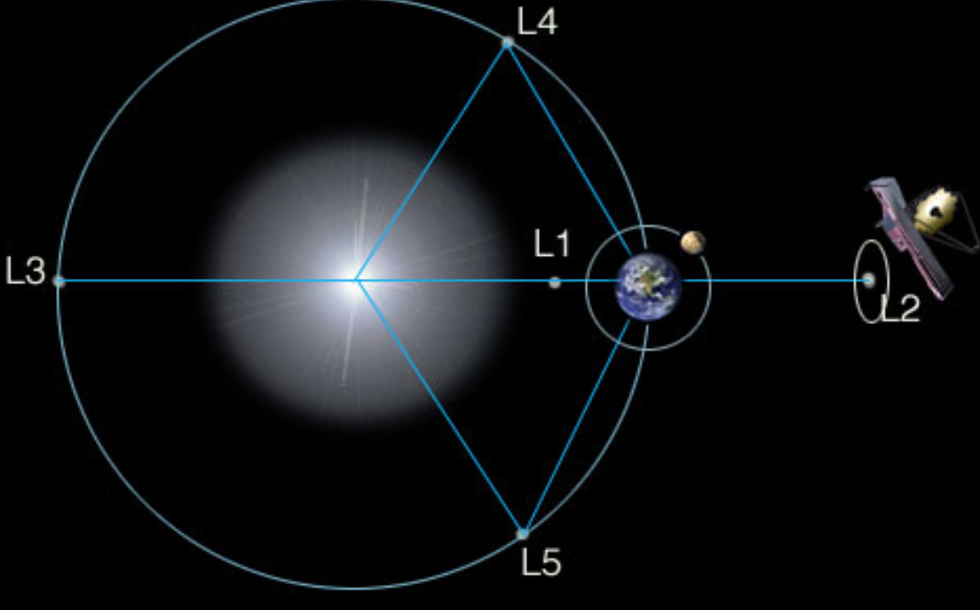 韦伯将在距离地球150万公里的拉格朗日2点(L2)处绕太阳运行,并与地球保持同步。