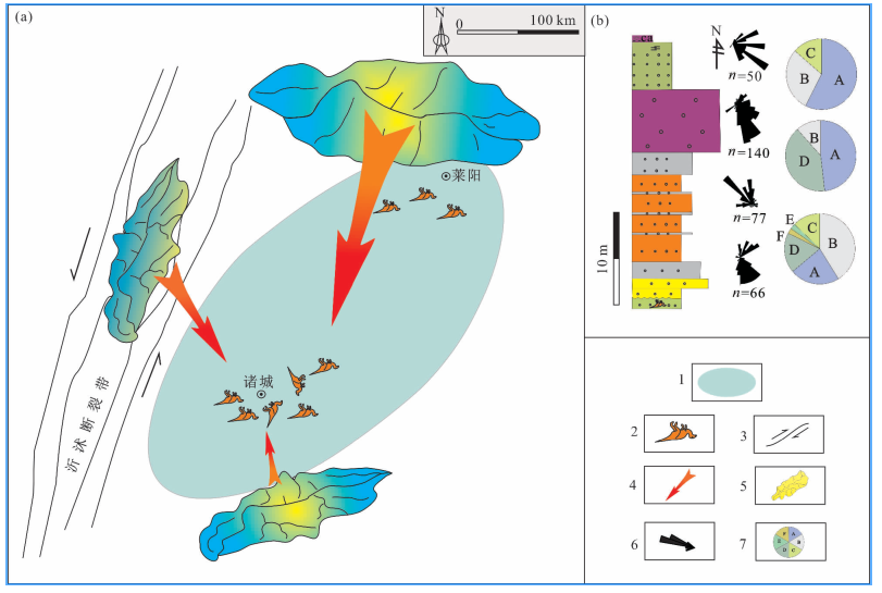 山东诸城地区王氏群恐龙化石层沉积物源图(1—沉积区;2—恐龙化石;3—郯庐(郯城—庐江)断裂;4—物源方向;5—古剥蚀区;6—古水流;7—砾石组分。A—安山岩;B—凝灰岩;C—流纹岩D—玄武安山岩E—凝灰质砂岩F—凝灰角砾岩)