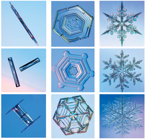 由于大气中冰晶的温度和湿度条件也不断变化,使得冰晶面上、边上和角上各种部分增长的速度不一致。如果水汽只在冰晶面上凝华,形成的是柱状雪花;如果水汽在冰晶边上和面上凝华,形成的是片状雪花;再如果冰晶面上、边上、角上都有水汽凝华,有尖角处位置突出,凝华增长得最快,多形成的是枝状或星状雪花。因此,由于大气的温度和湿度不断变化,雪花呈现千变万化的形态。形状、大小完全一样或完全对称的雪花,在自然界中是无法形成的。