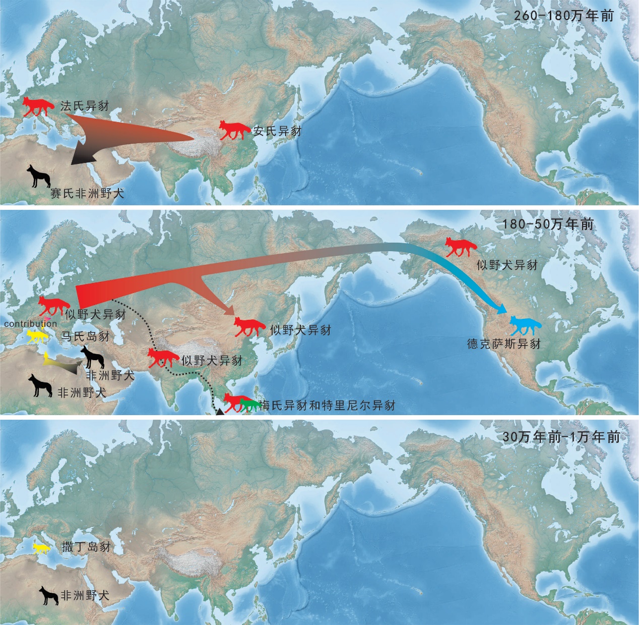 由此可见,如今声名赫赫的狼并非一直以来就生活在广袤的大草原里。在更新世的绝大多数时间里(250-50万年前),异豺家族才是犬科动物中的老大。直到异豺大约在50万年前灭绝,犬属动物才抓住机会,最终演化出狼这样的强大物种,取代了异豺之前的位置。