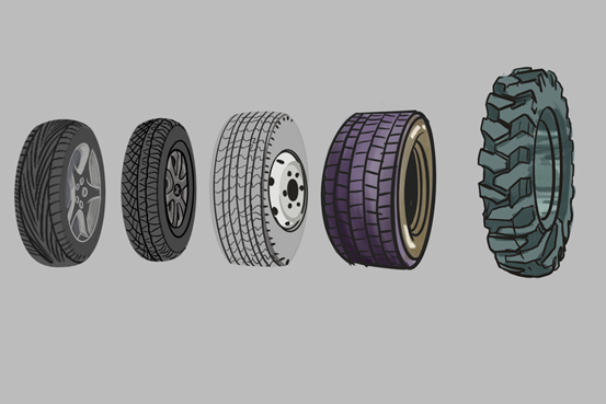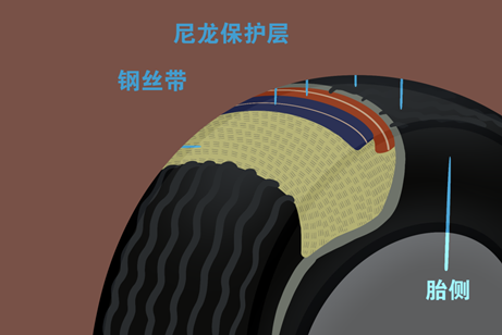 为了进一步提高轮胎的耐磨性和缓冲能力,还出现了子午线轮胎。它是由帘布层、带束层、胎冠、胎肩和胎圈组成。在它的外层,分布几层由钢丝编成的钢带帘布,当汽车行驶在崎岖路面时,它们可以有效降低轮胎被异物刺破的概率。
