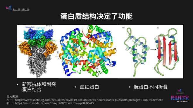 这里展示了蛋白质结构与功能的三个例子。左边这幅图显示了新冠抗体和病毒刺突蛋白结合的样子,抗体通过和刺突蛋白结合,就可以阻挡新冠病毒进入人体细胞。中间这幅图片是一个血红蛋白,它的主要功能是帮助我们把氧气运输到人体各个地方。怎么运输?你看到中间有些小球,这些小球表示的是铁原子。血红蛋白把铁原子包裹起来,铁原子跟氧气结合,通过这种方式把氧气运输到各个细胞里面去。最右边的蛋白(朊蛋白)跟疯牛病有关系,这里显示了朊蛋白两种不同构型,左边的构型是正常的折叠状态,右边的是不正常的折叠状态。如果朊蛋白的折叠是右边这个形状的话,就会引起疯牛病。