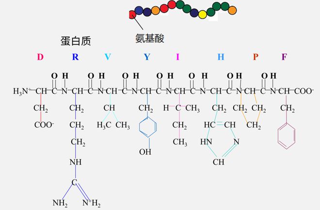 蛋白质由很多氨基酸通过化学键串在一起。这里我用一些小球去表示这些氨基酸,每种颜色的小球表示一种氨基酸。从数学角度,你也可以用一个字符串去表示一个蛋白质的氨基酸序列。每个氨基酸都是由几十个原子形成的,在这页幻灯片的下半部分,我画了一些原子结构,大家可以对蛋白质的分子式有一个直观的认识。现在我们只要知道氨基酸序列,就能知道蛋白质的分子式。