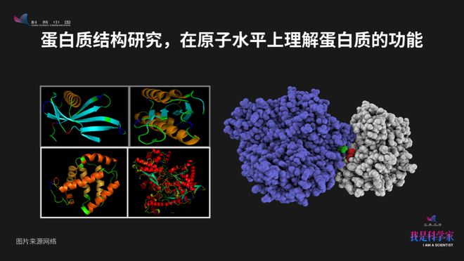 这张幻灯片的左边展示了四个不同蛋白的结构,很漂亮,我们用软件把它画成了卡通形式,简化了结构的复杂度。但在右边,我们把蛋白质复合物的原子都画出来了,就变得非常复杂。我们可以用不同软件、不同表示形式把蛋白质的三维结构给画出来,去观察蛋白质到底长什么样。根据蛋白质的结构,我们可以在原子层面去分析、去预测这个蛋白质它到底会执行什么样的功能。