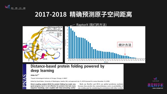 2017年和2018年,我们进一步推广了这个算法,把之前预测“氨基酸靠得比较近还是离得比较远”推广到预测两个原子在空间中的距离。比如说,我们可以预测蛋白质里面两个原子在空间中的距离是5埃,还是6埃, 7埃。根据预测出的距离,我们可以把三维坐标重构出来。后来我们把这个想法写成一篇论文,发表在2019年《美国国家科学院院刊》上面。