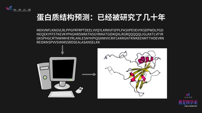 计算机预测蛋白质结构这个问题本身的定义很简单:假设我们有了一个蛋白质的氨基酸序列,能不能把它输入到计算机里面去,让计算机输出每个原子的三维坐标?然而,实际操作中是非常困难的,到目前为止已经研究了将近六十年了。