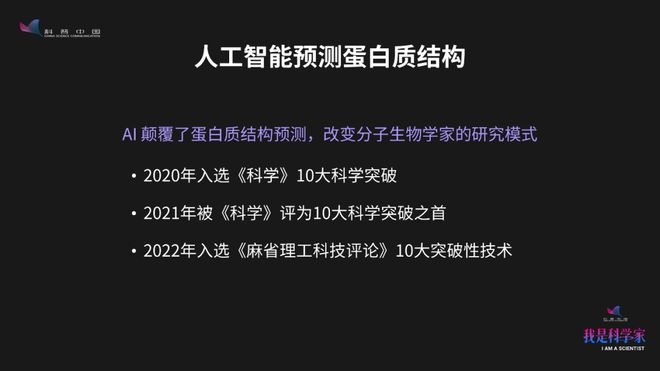 在2020年,人工智能预测蛋白质结构入选了《科学》杂志评出来的“十大科学突破”;到2021年又被《科学》杂志评为“十大科学突破之首”;在今年被《麻省理工科技评论》评为“十大突破性技术”。
