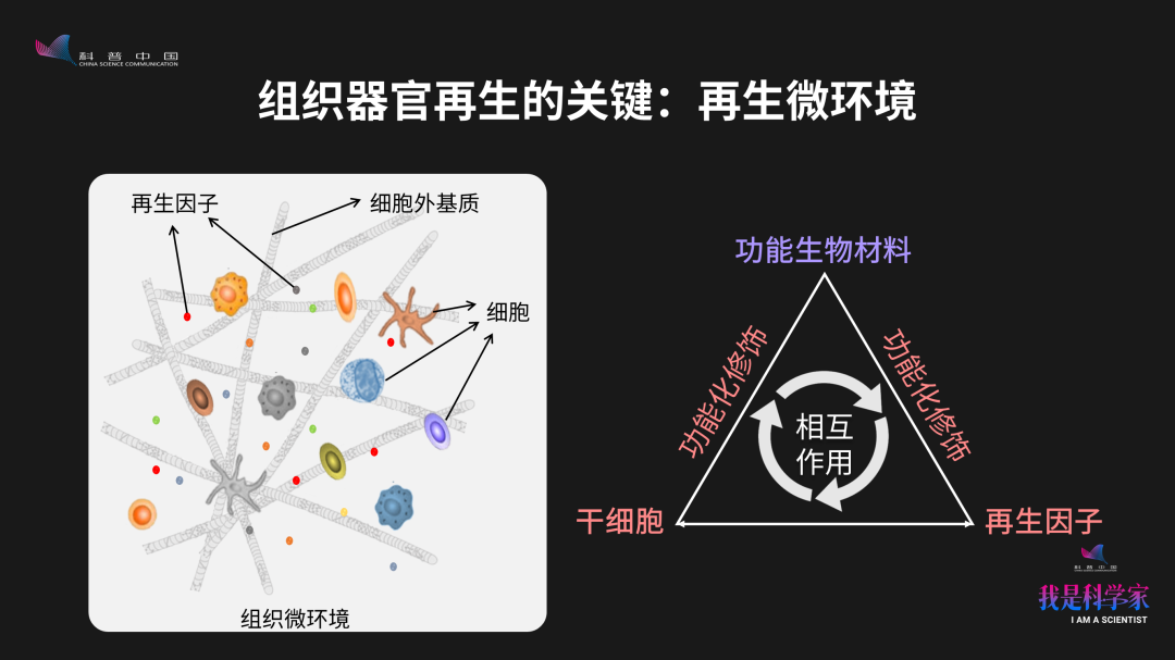 “微环境”这个名词听起来很抽象,大家可能听到更多的是宏观的商业环境、生活环境等等,其实我们任何一个组织取出芝麻粒、小米粒那么大,放在显微镜下看,大概都是上图左侧的结构,有很多的支架、外基质和结构蛋白来支撑各种细胞位置和存在;另外还有很多的再生因子和信号分子,通过支架材料形成的浓度梯度,支撑细胞的生成和分化。要让它从一个抑制再生微环境变成促进再生微环境,就需要利用生物材料来调控细胞,调控生长因子的分布,需要核心的技术。