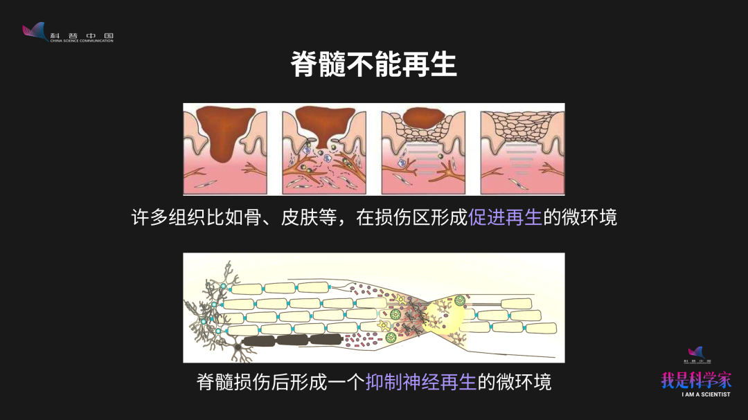 为什么脊髓损伤修复为什么这么难?因为理论上脊髓组织根本就不能再生,它不像我们经常听说的“伤筋动骨一百天”。骨和皮肤的损伤有一个自愈过程,一旦损伤,就会有大量的干细胞或生长因子到损伤部位帮助再生。但脊髓损伤不一样,包括脑损伤也不一样,中枢神经不能再生的原因是从保护角度,一旦损伤以后,它会大量形成胶质瘢痕,防止损伤进一步扩展,同时也阻碍了再生。所以我们在脊髓损伤和再生研究过程中,主要思考的是怎么去重建一个再生的微环境。