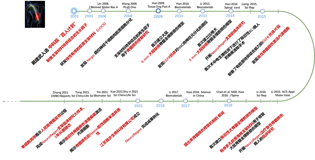 在这张图中,我回顾了我们实验室二十年来围绕着脊髓损伤研究的一些里程碑式的工作;但里面有很多东西是写不上去的,因为都是失败的工作。