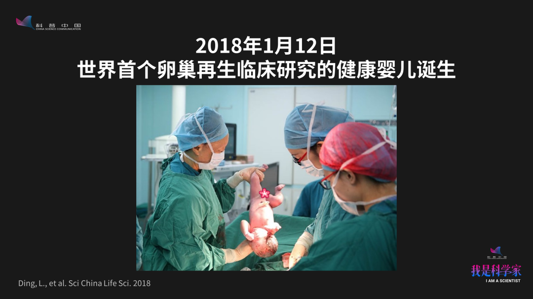 还有一个跟生殖相关的,卵巢早衰。有些年轻人19岁20岁就没有月经了,卵巢就不激活了,所以根本就谈不上怀孕和生孩子。对应于卵巢早衰这个不治之症,我们跟南京鼓楼医院生殖中心孙海翔主任合作,设计了个可注射的支架,主要是引导卵巢周围的血液循环,帮助卵巢的发育。我们发现二十例病人都能够激活卵巢,其中有两例病人怀孕,但有一例可能因为年纪比较大,胎儿被诊断为21三体综合征,只能终止妊娠。最后在2018年1月12日,首个世界上卵巢早衰临床治疗的病人在南京鼓楼医院诞生了第一个婴儿,这也是一个标志性的成果,证明卵巢早衰再也不是不治之症。