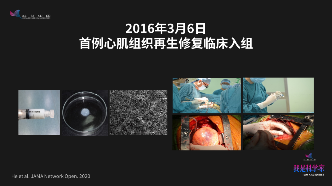 我们把治理沙漠的理念拿来做心肌再生,如果一个土地沙漠化了,把水引进来就会变成绿洲,如果让坏死的心肌里面长出血管来,是不是心肌就能再生?所以我们设计了一款可注射的胶原,发现在猪的心梗模型上能够重新让心肌再长回来,在2016年3月又组织了60例心衰病人的临床,经过一年的随访,发现确确实实严重的心衰病人的心肌可以再生。所以我觉得这个临床的意义非常大,可以为我们无数心血管病人,特别是心梗病人带来希望。这项工作最近发表在临床比较有名的JAMA杂志上。