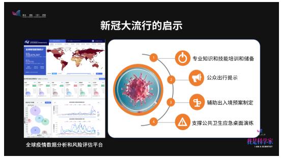 这期间,因为一些旅行限制,很多非新冠项目也停止了,所以我们利用这个机会就打造了,国内第一个全球疫情数据分析和风险评估平台。未来它将承载着全球新发、再发传染病的监测和风险分析,及时向卫生人员提供专业知识和技能的培训,为公众出行提示做支持,辅助决策者的决策,同时支持一些桌面的演练。这个平台也被纳入到2021年李克强总理参加的第24次中国-东盟领导人会议,未来将与很多国家共享、共建。