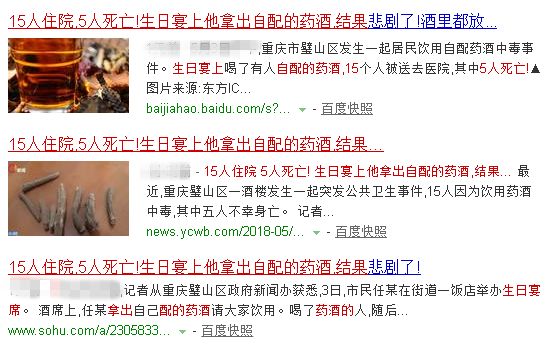 5月3日中午,重庆市璧山区发生一起居民饮用自配药酒中毒事件。生日宴上喝了有人自配的药酒,15个人被送去医院,其中5人死亡!