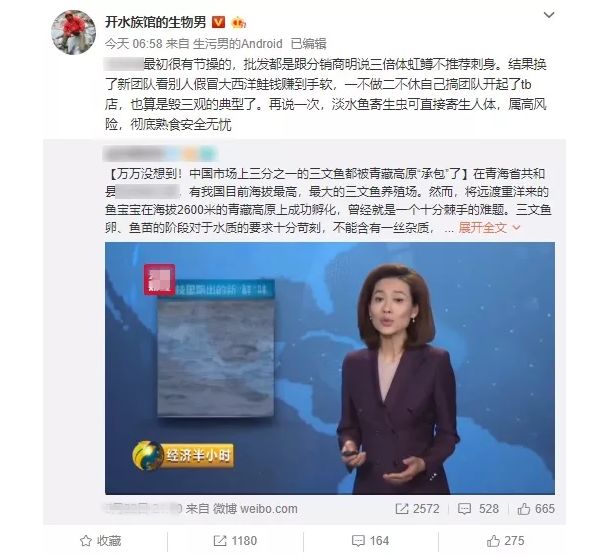 微博上一位认证为水产专家的大V“开水族馆的生物男”转发了该报道,并称,所谓国产三文鱼和消费者所熟知的三文鱼不是一种鱼,实际上是淡水虹鳟鱼,寄生虫可直接寄生人体,生吃存在很高的风险。