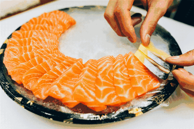 三文鱼:鱼片一般都是切成厚块(0.7cm-1cm左右),厚度很厚。