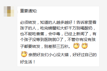 最近,朋友圈现一条“紧急提示”:吃完螃蟹和大虾千万别马上喝酸奶,也不能吃香蕉,否则会中毒!这则消息中甚至指出有孩子在吃完大虾后喝酸奶,由于救治不及时而致死。