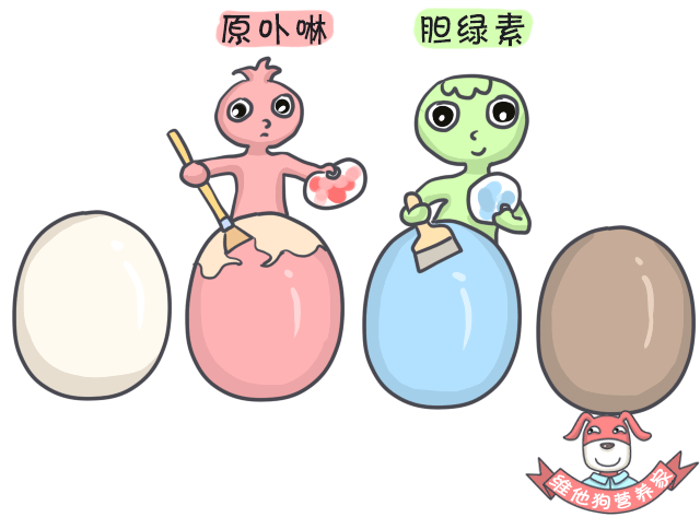 例如:有些鸡血液中的血红蛋白代谢可产生卵壳卟啉,因而鸡蛋壳呈浅红色;
