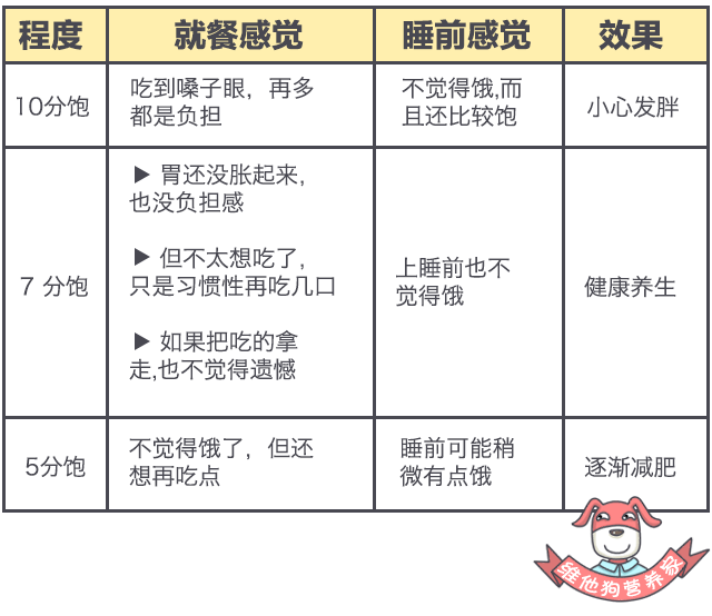 很多人不太明白几分饱到底是多少,维他狗列了一张表格,你们可以做参考,自己平时再多尝试摸索,就能知道自己需要吃多少了