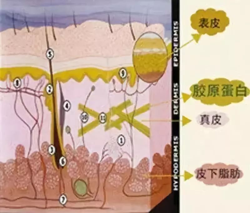 Ⅰ型、Ⅱ型、Ⅲ型胶原蛋白存在于细胞之间,其中,儿童皮肤中以Ⅲ型胶原为主,成年人皮肤中以Ⅰ型胶原为主。