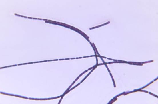 高倍显微镜下,经革兰氏染色的炭疽芽孢杆菌(图片来自于phil.cdc.gov美国CDC公共卫生图片素材库)