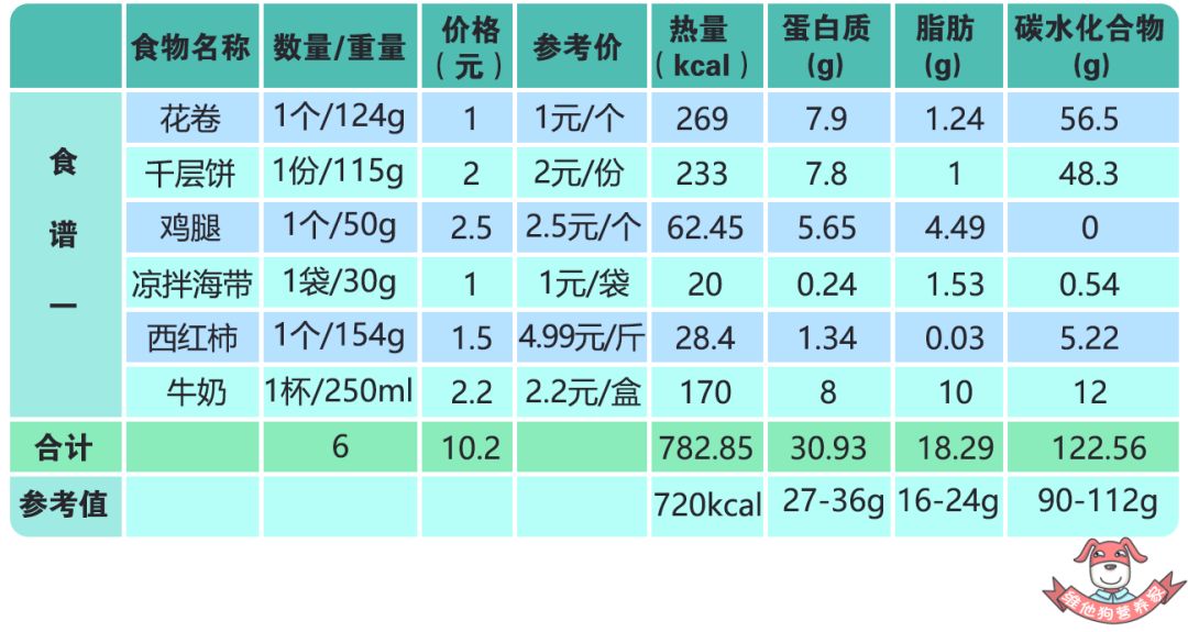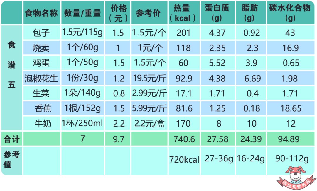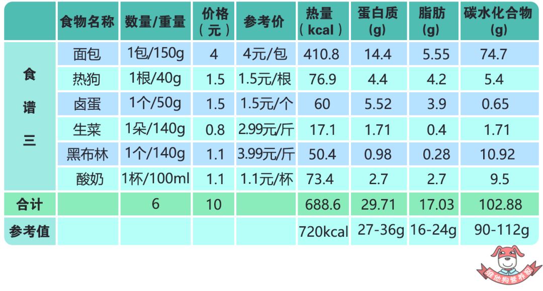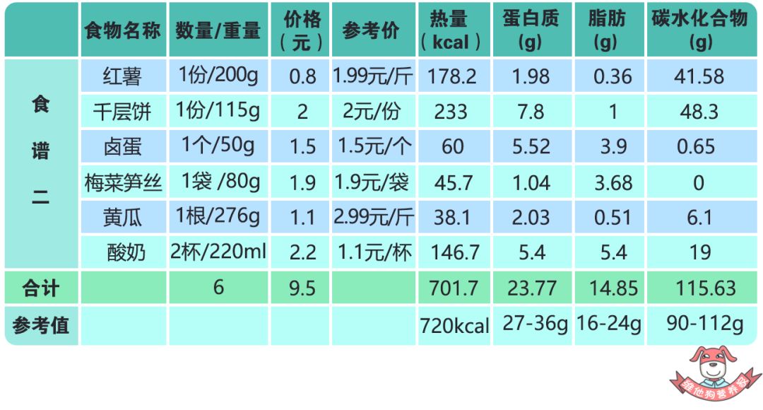 参考值:热量720kcal、蛋白质27g-36g、脂肪16g-24g、碳水化合物90g-112g