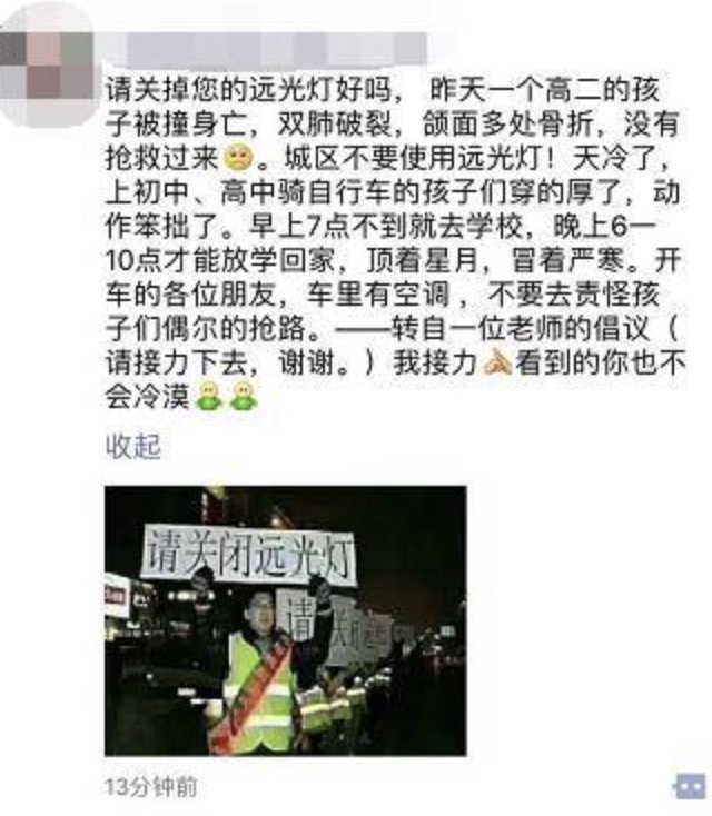 【传闻】10月,朋友圈突然广传一份倡议书,上面写着:“请关掉您的大灯好吗,昨天一个高二的孩子被撞身亡,双肺破裂,颌面多处骨折,没有抢救过来。”