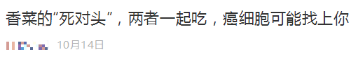 文章里写到,香菜不能和黄瓜、猪肉一起吃,和黄瓜一起吃会破坏维生素C,和猪肉一起吃会耗气伤身。长期这样食用,还可能有致癌风险!