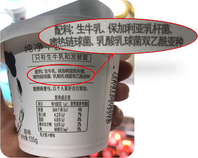图中配料表成分:生牛乳、保加利亚乳杆菌、嗜热链球菌、乳酸乳球菌双乙酰亚种。验证通过。