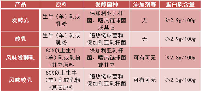 现在我们用一张对照表来总结一下发酵乳、酸乳、风味发酵乳、风味酸乳之间的区别与联系。