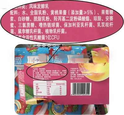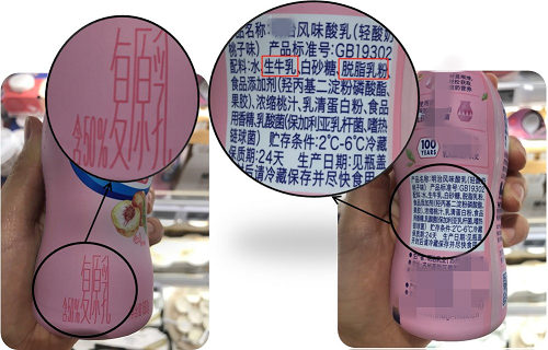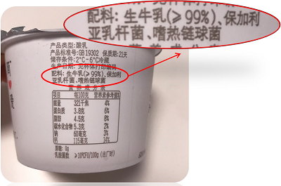 所以,这款标注“复原乳”的风味发酵乳,应该是全部用乳粉生产的,其配料表中应该有乳粉,但没有生牛(羊)乳。看一下它的配料表,是不是我们的分析一致?